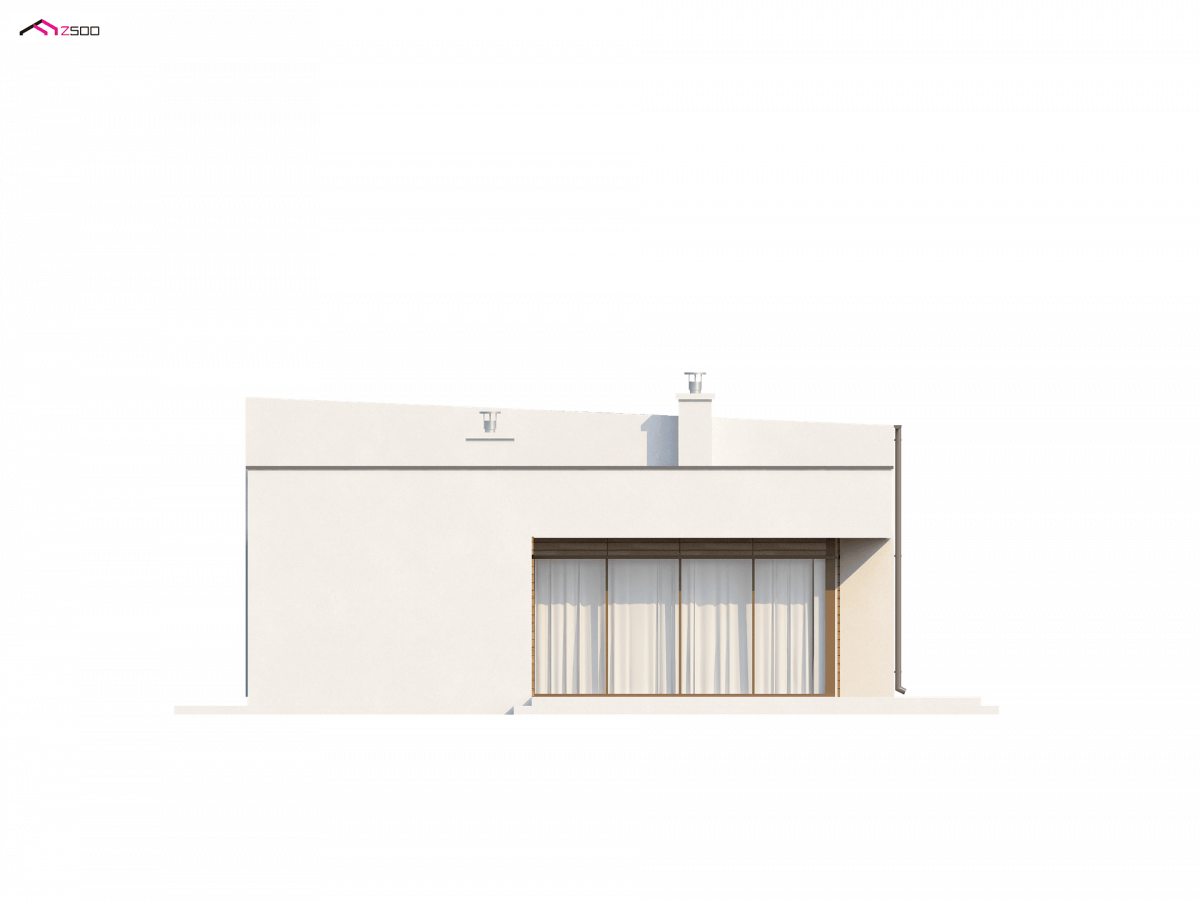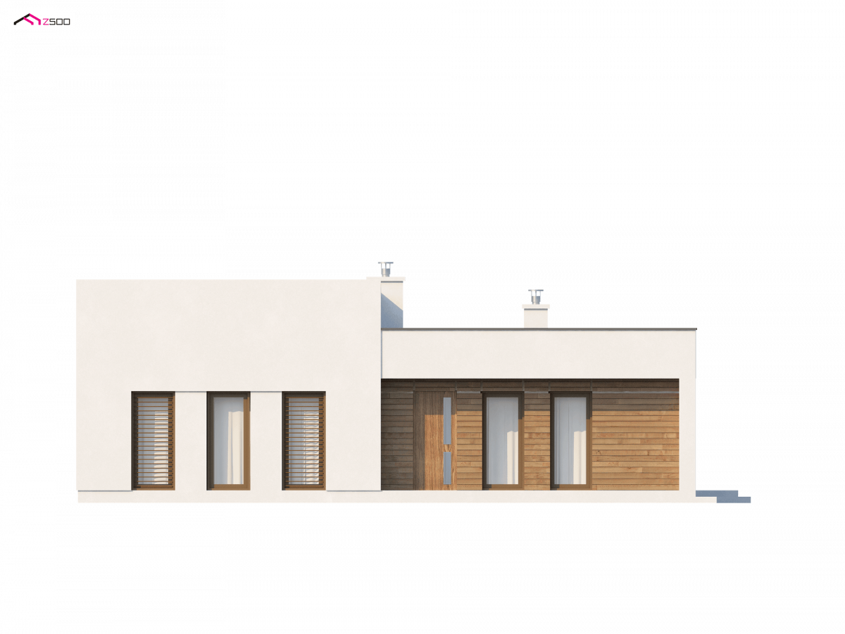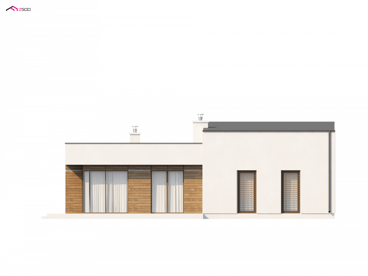 Zx35 is a modern one-story house with a flat roof. It owes its innovative character to a simple block, roof slopes hidden behind the attic and large glazing in the living room. White plastered facade and wooden cladding are a great complement to the modern style.