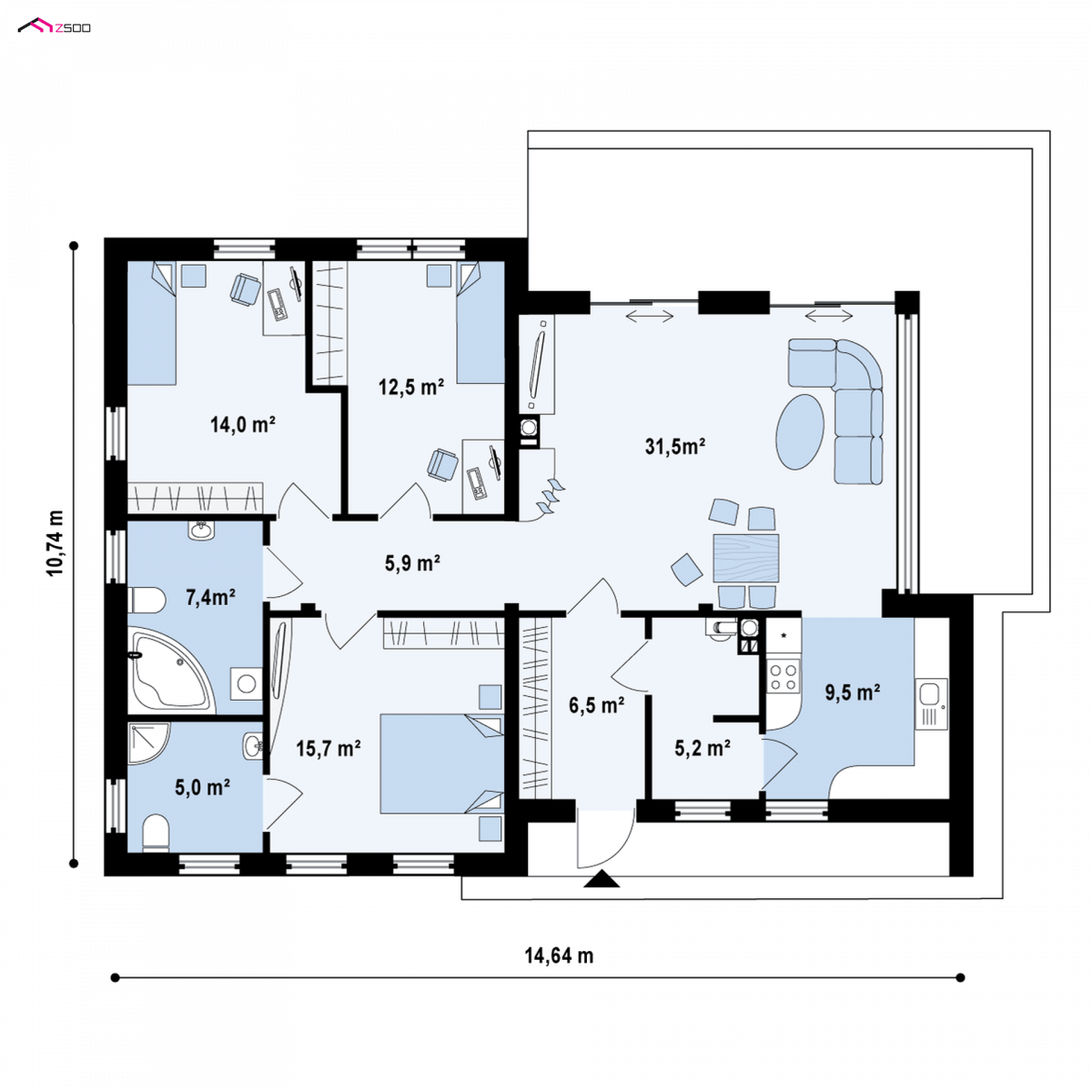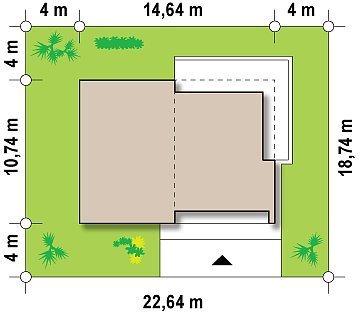The rest of the house is three comfortable bedrooms, which can be separated from the living area, e.g. by folding doors. The largest of them has its own bathroom, illuminated with two windows, with a shower. A large wardrobe in the hall will certainly accommodate the most necessary things and lumber. A compact house can be adapted as low-energy.