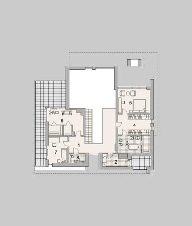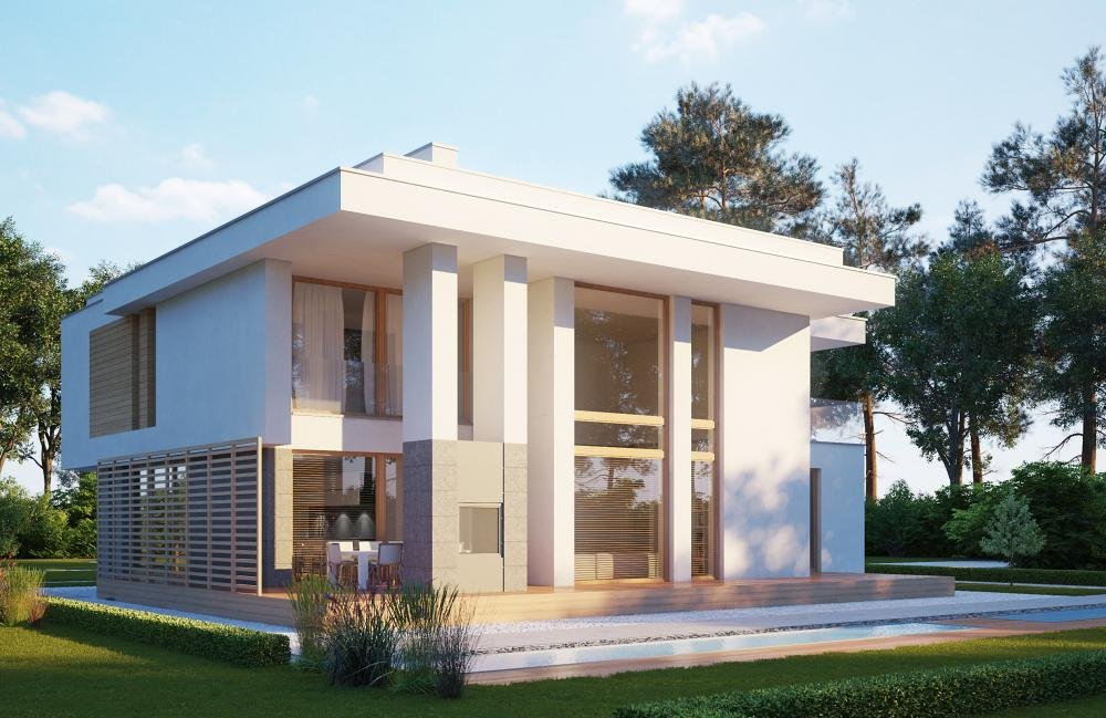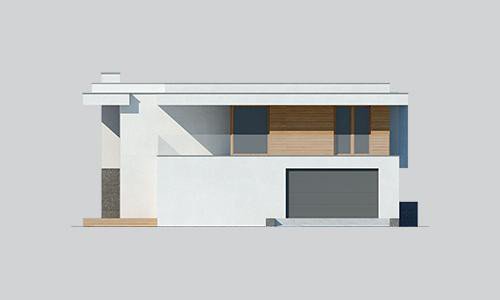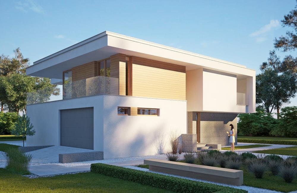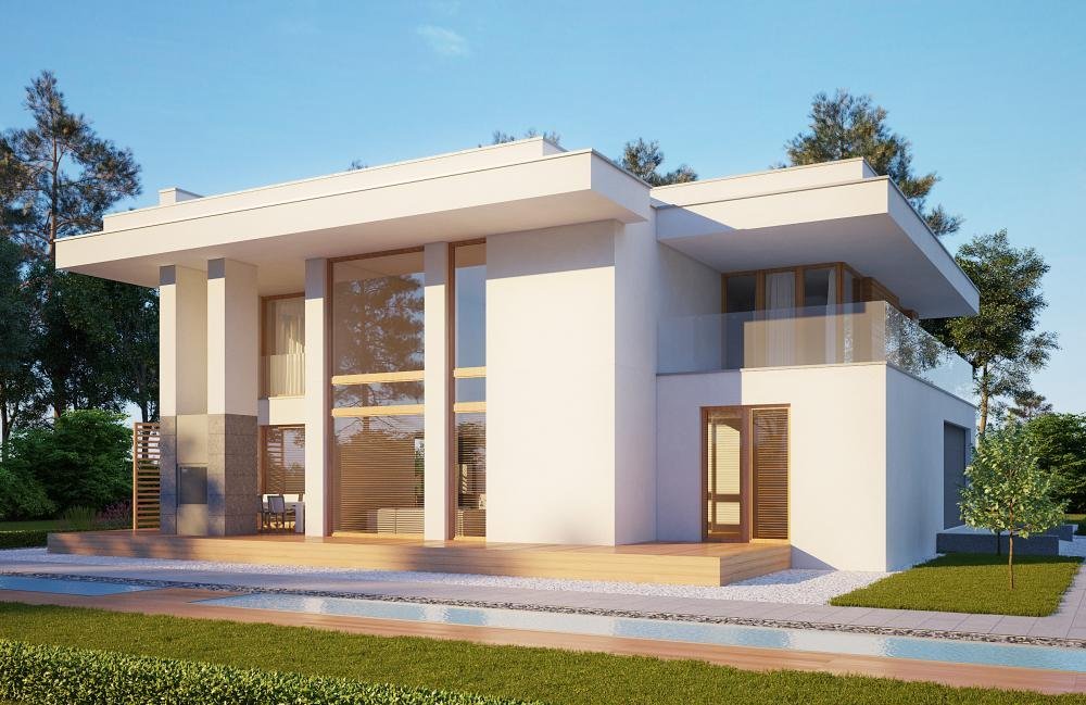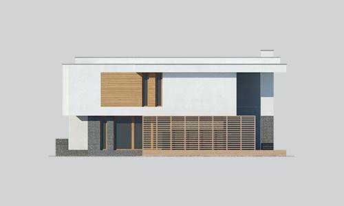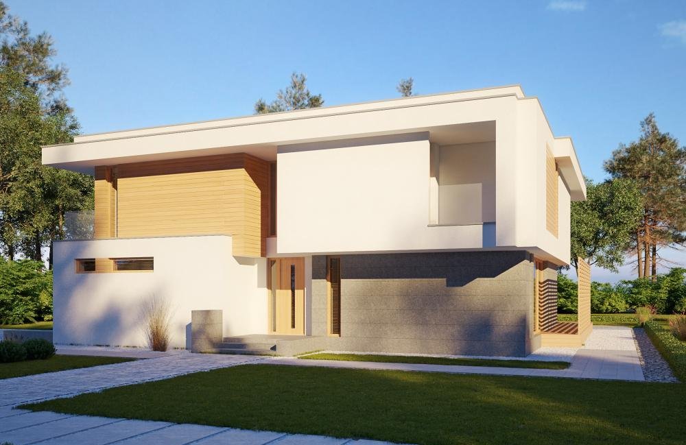 Modern two-story house design. On the first floor there is a bedroom, next to it a spacious wardrobe and a place for fitness.